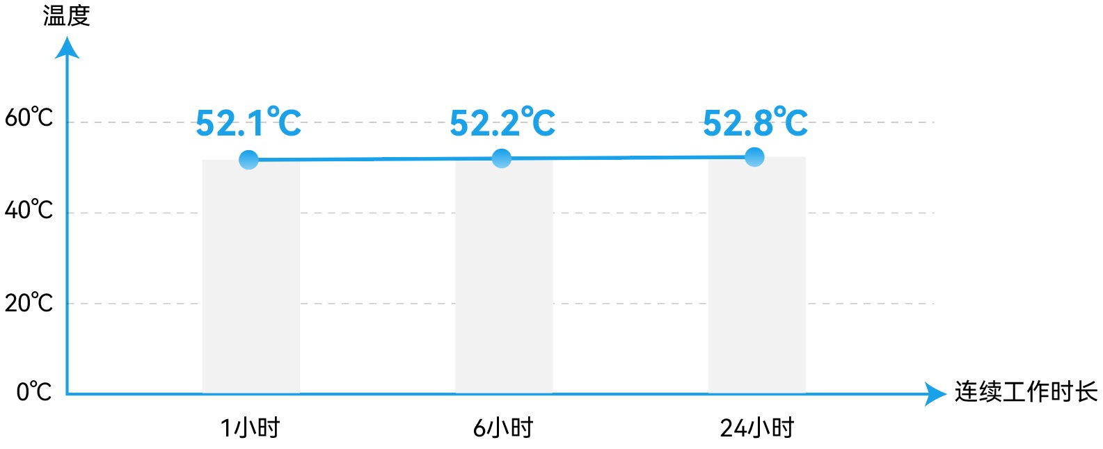 室温25℃同一工况下,eRob80F_V4连续工作1小时、6小时以及24小时温度分别是52.1、52.2和52.8℃,连续工作24小时温度仅升高1℃。正常工作温度稳定在50℃-55℃。