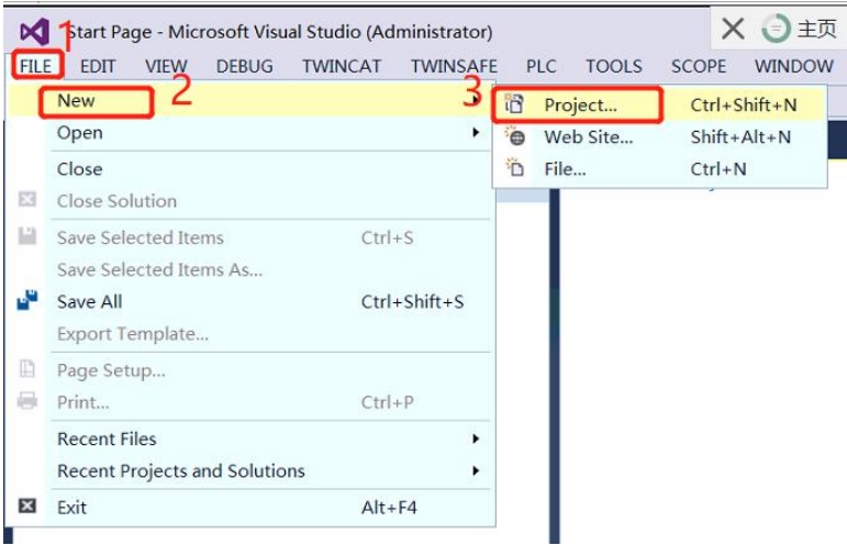 1. 如图1,打开菜单栏 File->New->Project,新建 TwinCAT 工程。