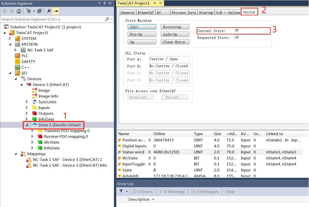6. 如图13,点击设备名 Drive1(Zerror Driver),点击“Online”,查看 EtherCAT 的状态机状态,如果 Current State 显示“OP”,说明驱动器正常进入 OP 模式。