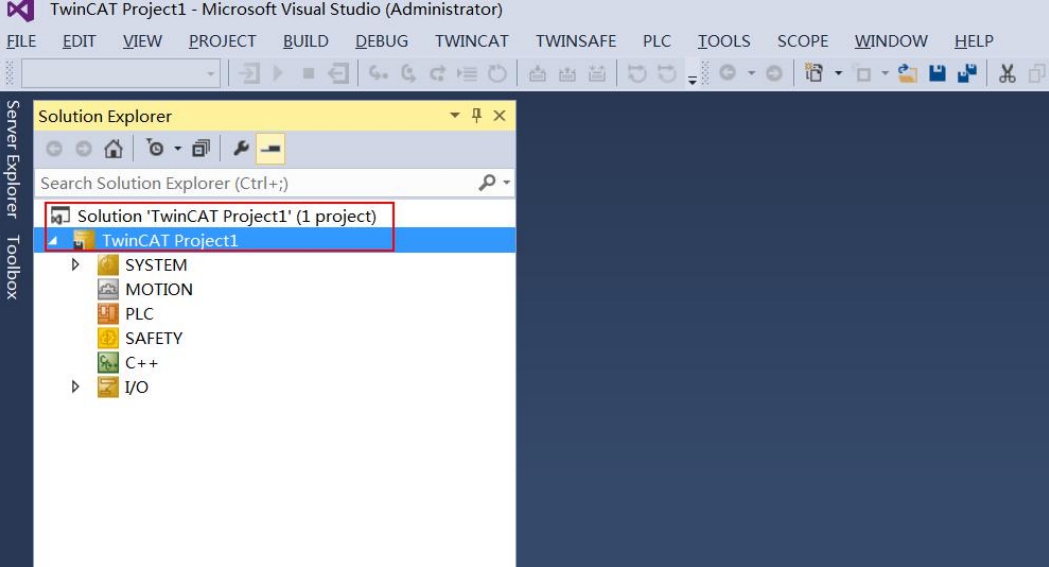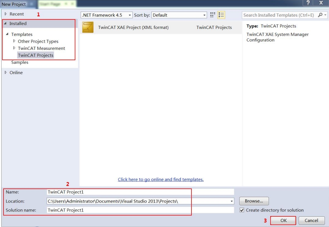 2. 弹出 New Project 窗口(如图2),选择右侧 Installed->Templates-> TwinCAT Projects, 以英文名命名工程名(Name),选择工程存放路径(Location),点击“OK”按钮,则新建了一个名为“TwinCAT Project1”的工程(如图3)。