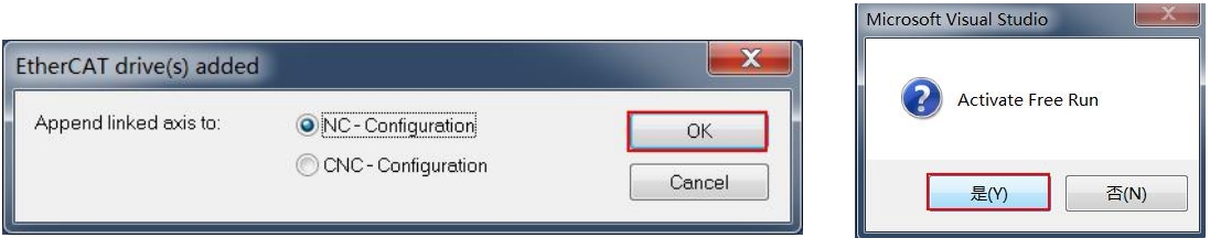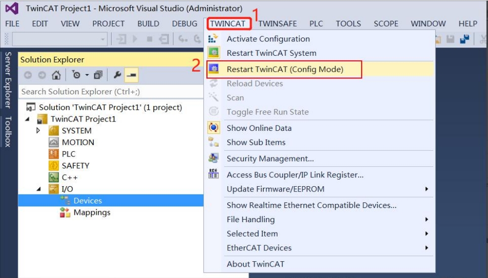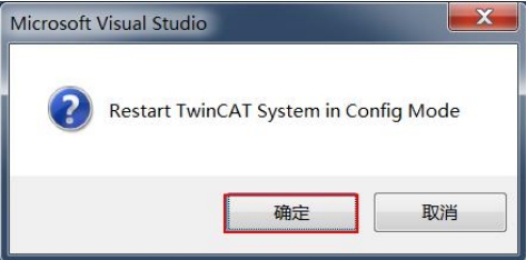 3. 如图 4,点击菜单栏 TwinCAT->Restart TwinCAT(Config Mode),弹出 Microsoft Viusal Studio 窗口(如图5),点击“确定”按钮。