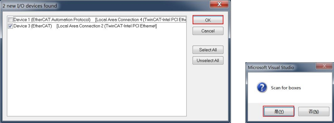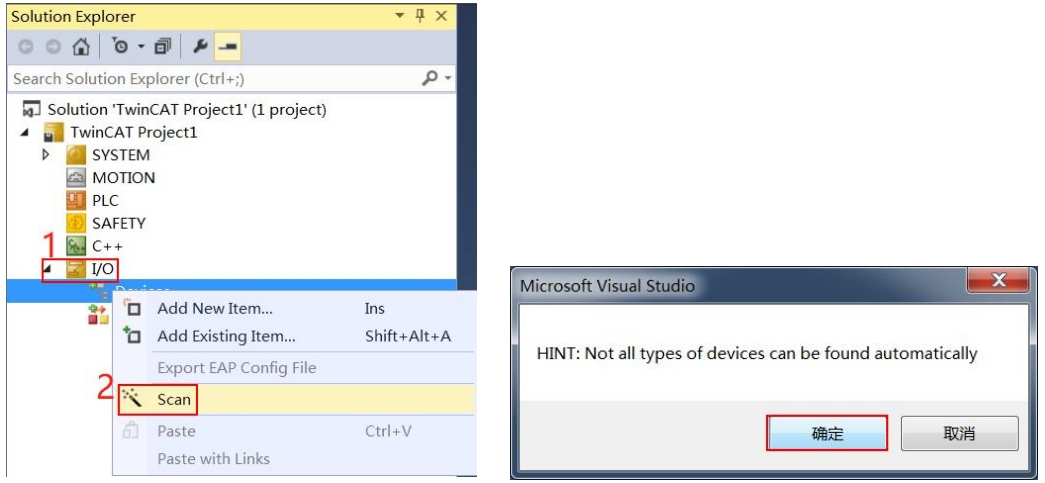 4. 如图 6,选择工程目录下 I/O,右键点击 Devices->Scan,弹出 Microsoft Viusal Studio 窗 口(如图7),点击“确定”按钮。弹出“new I/O devices found”窗口(如图8),显示自动勾选的设备即为扫描到的从站设备(若未显示自动勾选的设备表明未扫描到从站设备,需确认设备运行状态和网线连接是否正常),点击“OK”按钮。后续弹出窗口均点击“OK”或 “是”按钮即可(如图 9~图11)。