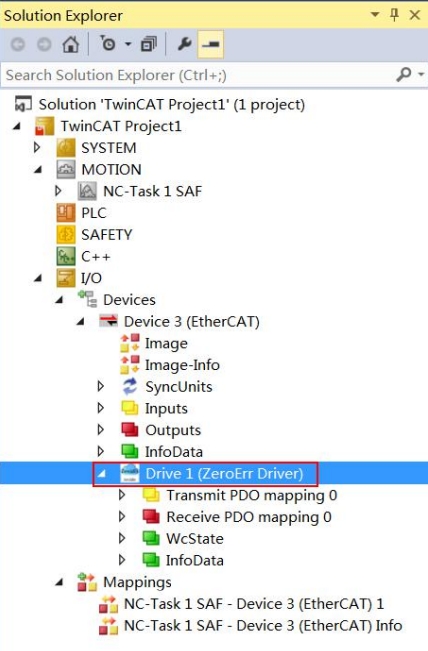 5. 到此如图12,“TwinCAT Project1”工程下 IO/Devices 路径下出现 ZeroErr Driver logo图标以及从站设备名 Drive1(Zerror Driver),表明主站成功扫描到并连接伺服驱动,否则需确认伺服对应 XML 文件及其放置路径是否正确。
